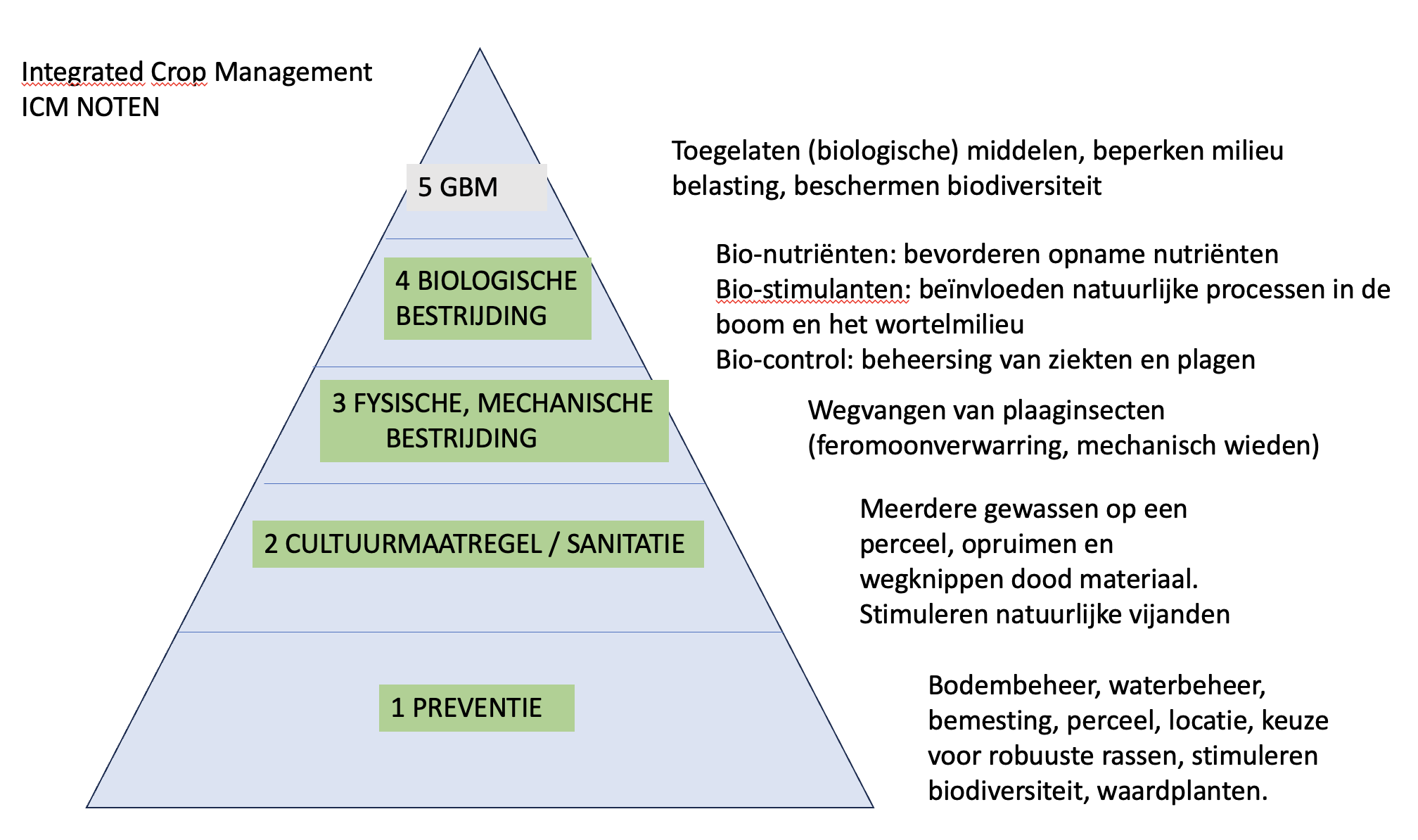 Om een duurzame (noten)teelt te realiseren is het van belang dat de ondernemers werken volgens de principes van ICM. ICM is een aanpak in de landbouw met als doel het terugdringen van het gebruik van gewasbeschermingsmiddelen en het realiseren van een gezonde, weerbare bodem en een weerbare plant.