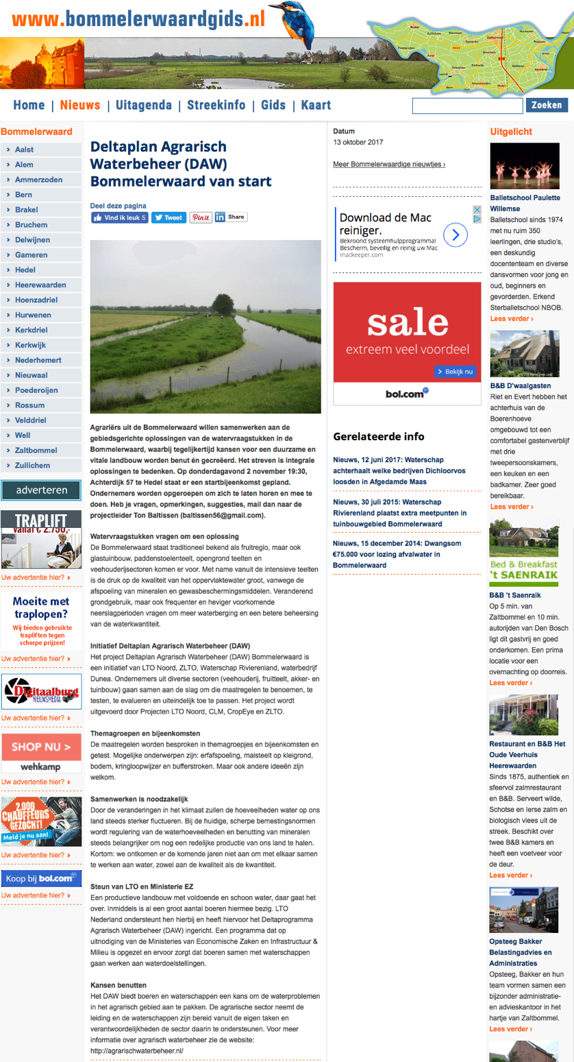 Het project Deltaplan Agrarisch Waterbeheer (DAW) Bommelerwaard wordt uitgevoerd door Projecten LTO Noord, CropEye, CLM en ZLTO en is een initiatief van LTO Noord, ZLTO, Waterschap Rivierenland, waterbedrijf Dunea.